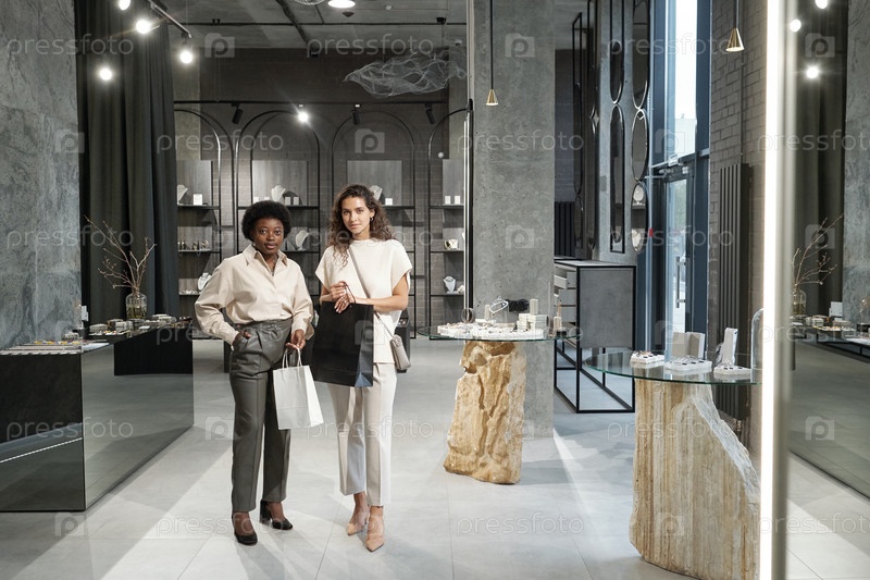 Два молодых межкультурных дружелюбных шопоголика с бумажными пакетами
