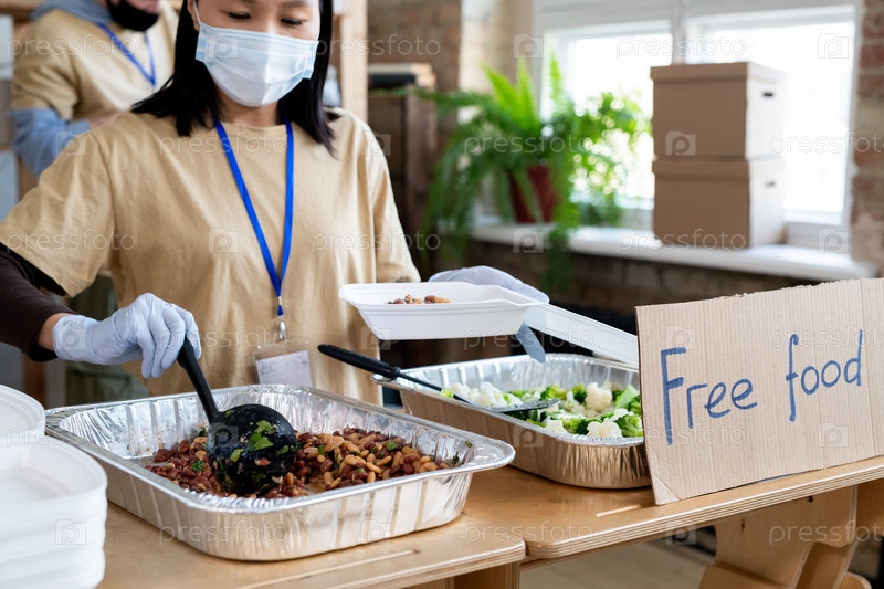 Женщина-доброволец кладет бобы в пластиковый контейнер