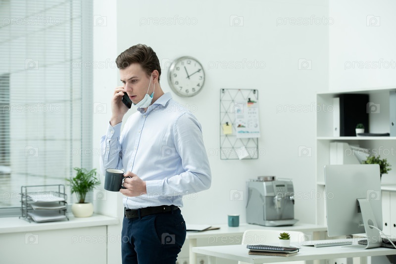 Молодой офисный работник с чашкой горячего напитка консультирует клиента на смартфоне