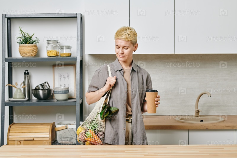 Человек, держащий мешок с свежими овощами и бумажный стакан кофе