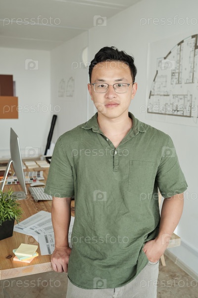 Молодой профессиональный дизайнер стоит на своем рабочем месте