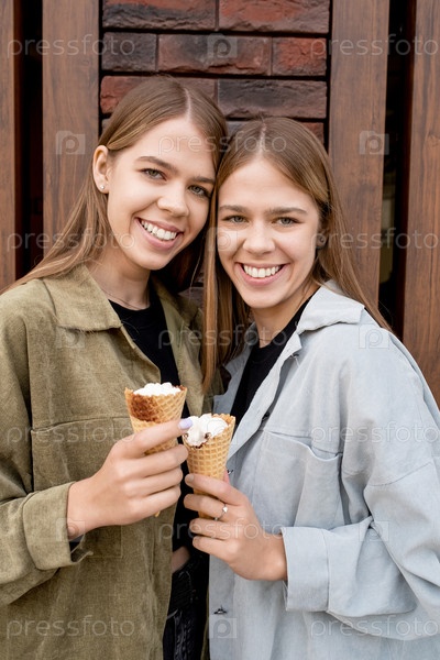 Красивые сестры-близнецы с длинными светлыми волосами, которые пьют мороженое