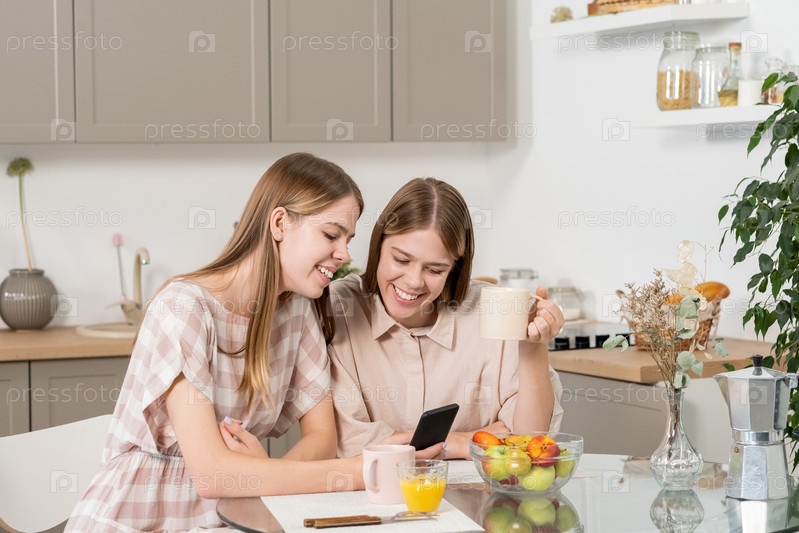 Милые девочки-подростки обсуждают любопытное видео в смартфоне