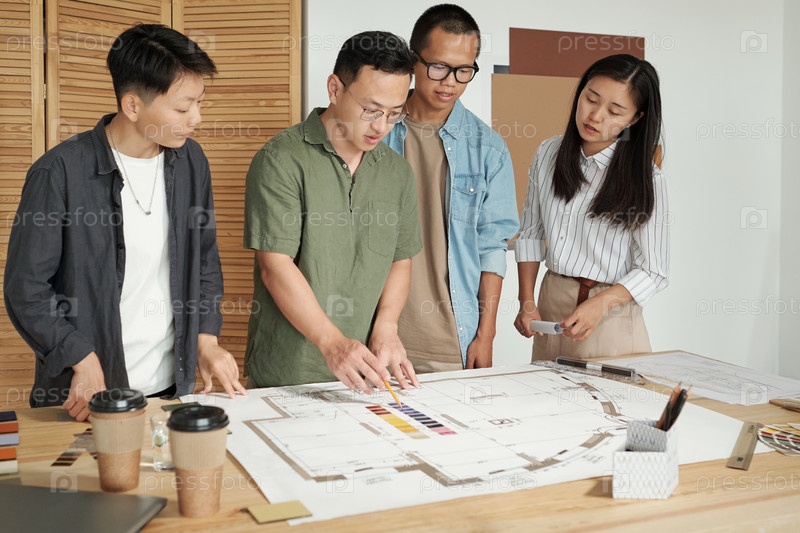 Большая группа архитекторов обсуждает эскиз строительства