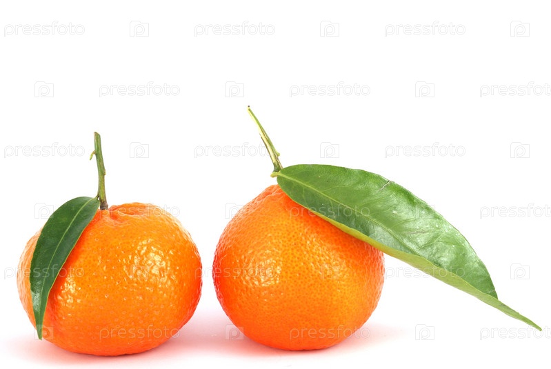 Спелые мандарины с зелеными листьями на белом фоне