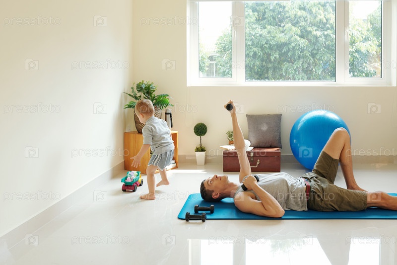 Молодой человек занимается спортом дома