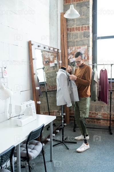Инвалидный мужчина с протезом ноги работает над новой курткой в мастерской