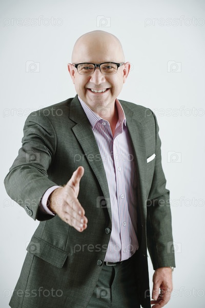 Веселый бизнесмен протягивает руку за рукопожатие