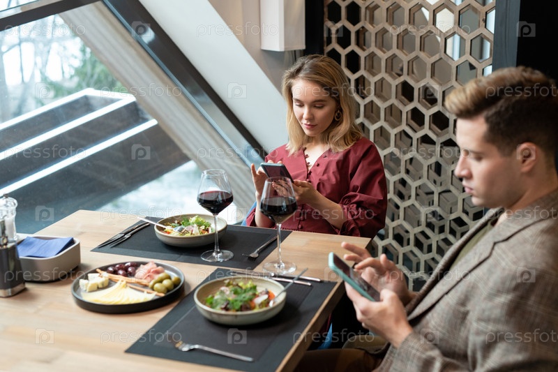 Молодые современные свидания в умной повседневной одежде прокручивают свои мобильные гаджеты