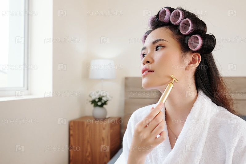 Женщина массажирует лицо с помощью ролика