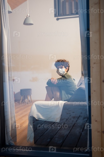 Молодая современная больная женщина в повседневной одежде и защитной маске сидит на диване
