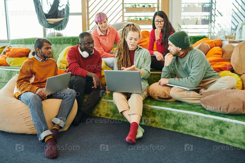 Молодые межкультурные менеджеры слушают творческую деловую женщину на встрече