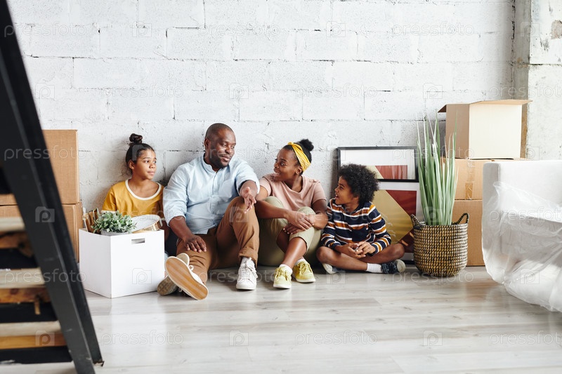 Современная африканская семья отца, матери, маленького сына и дочки-подростка отдыхают на полу