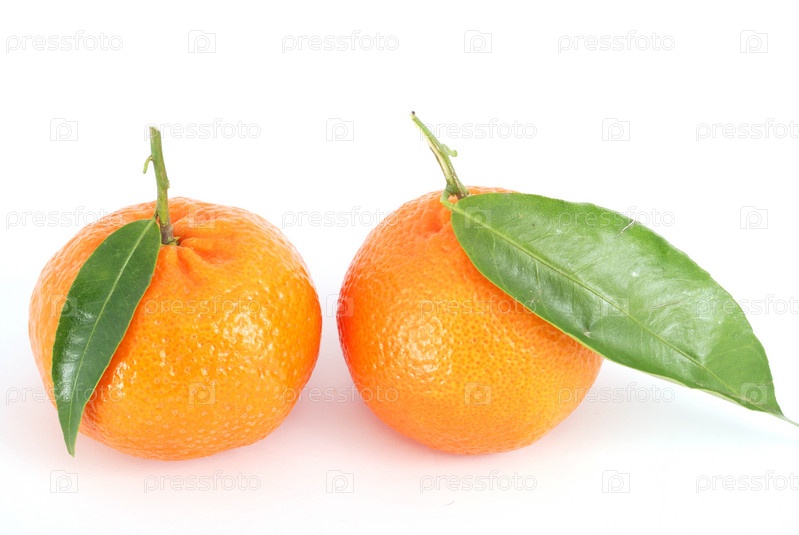 Спелые мандарины с зелеными листьями на белом фоне