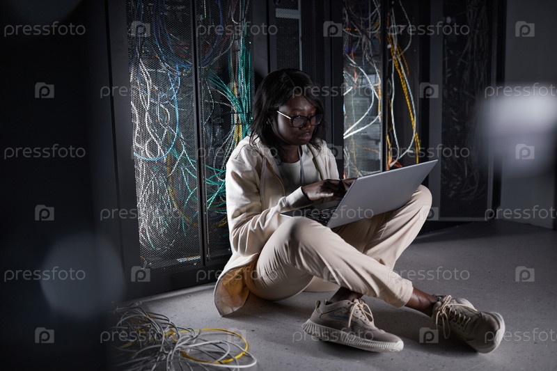 Американская женщина в темной комнате сервера Африканский американец
