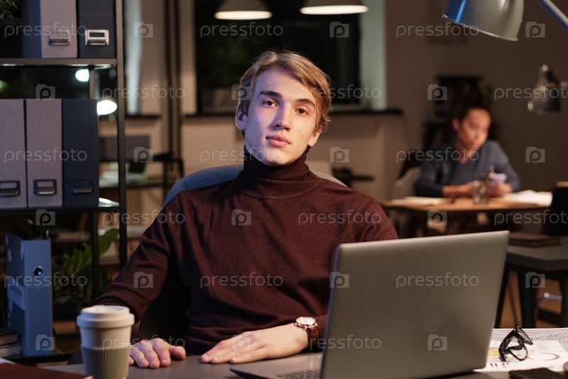 Портрет привлекательного молодого сотрудника в коричневом гардеробе, сидящего за столом с ноутбуком в темном офисе