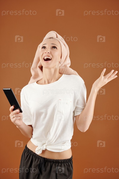 Взволнованная женщина со смартфоном