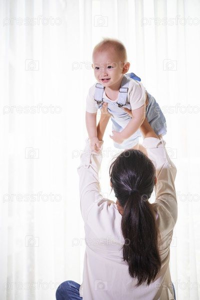 Мать поднимает маленького сына