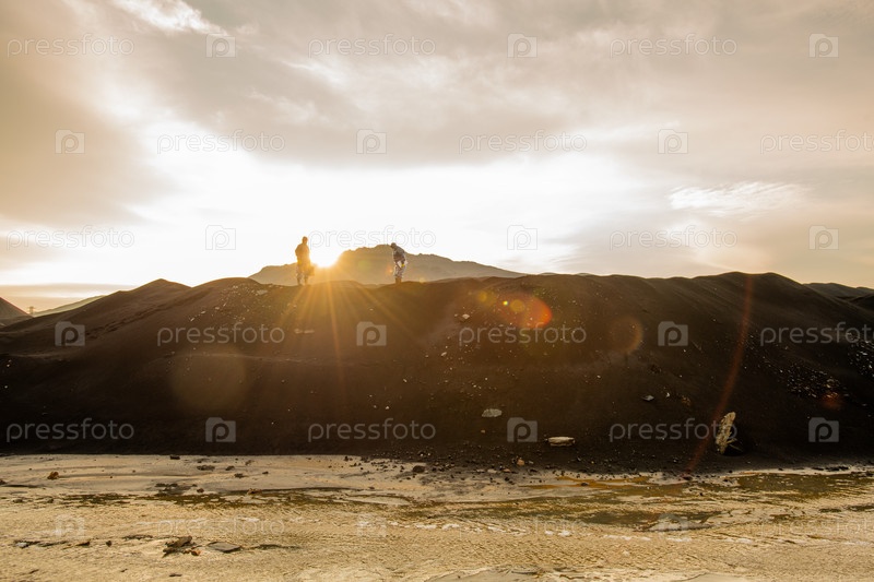 Крошечные силуэты двух современных исследователей, стоящих на вершине холма против серого облачного неба