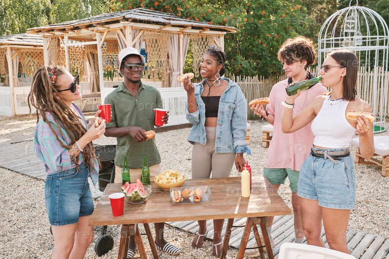 Молодые друзья, у которых есть хот-доги и напитки на свежем воздухе