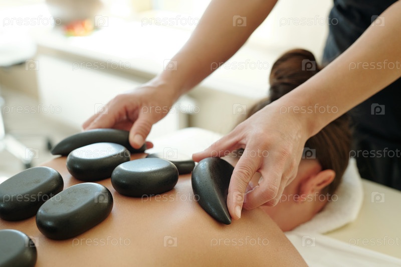Часть тела молодой женщины с горячими камнями на спине