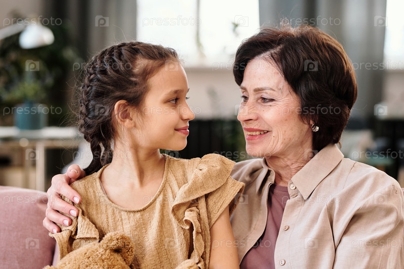 Ласковая зрелая брюнетка обнимает свою милую внучку