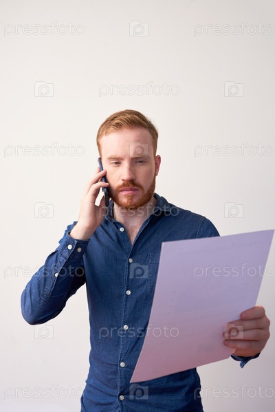Загруженный менеджер анализирует документ, изолированный на зеленом фоне