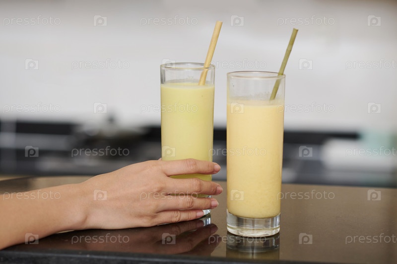 Женщина, принимающая бокал бананового смузи