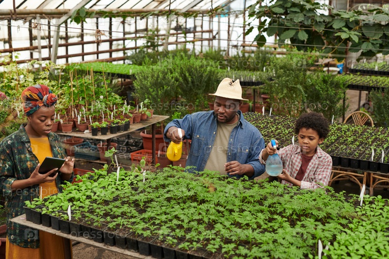 Семья поливает растения вместе