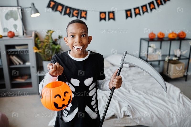 Американский мальчик-африканец на Хэллоуин Indoors