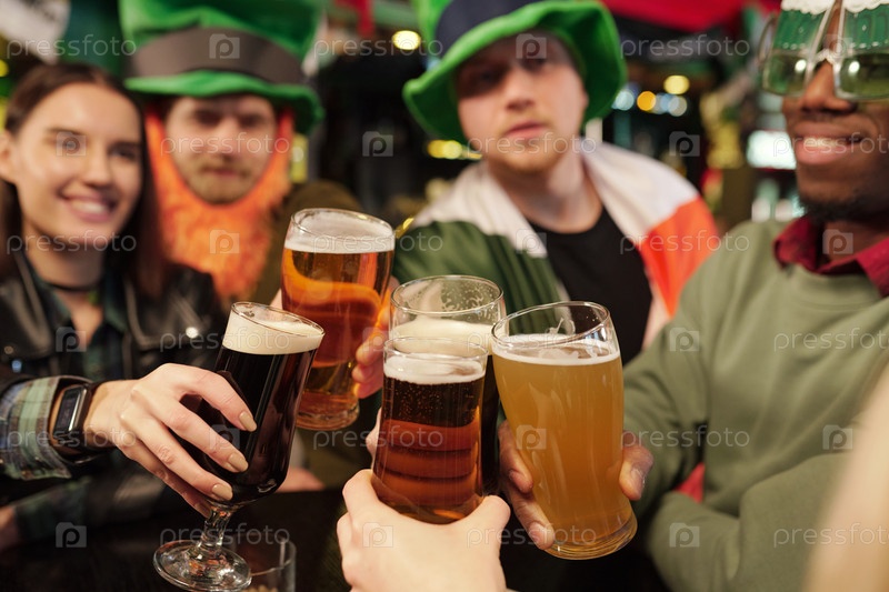 Группа счастливых футбольных болельщиков в традиционных ирландских нарядах, колочущих с пивом