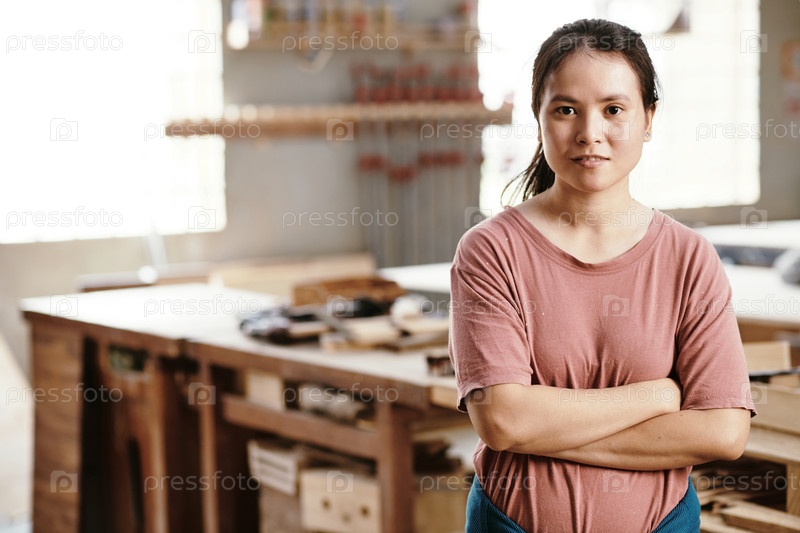 Женщина - плотница, стоящая в мастерской