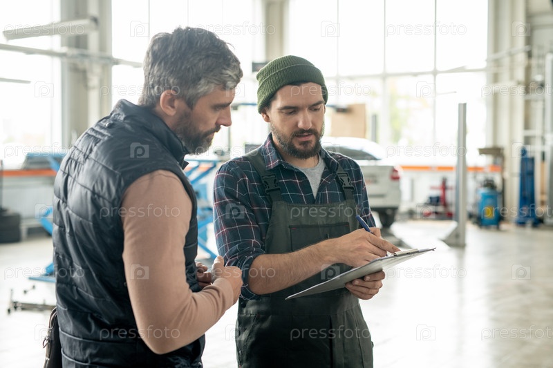 Серьезный бородатый мужской клиент современного автосервиса смотрит на документ