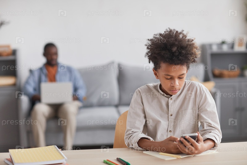 Африко-американский подросток использует смартфон во время учебы дома
