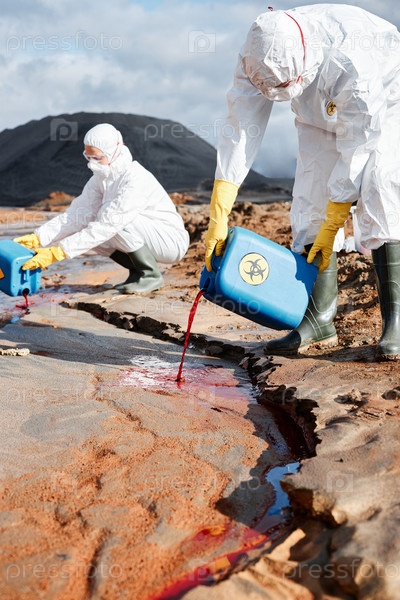Исследовательские ученые в костюмах и масках биологической опасности добавляют токсичную жидкость в грязную загрязненную воду