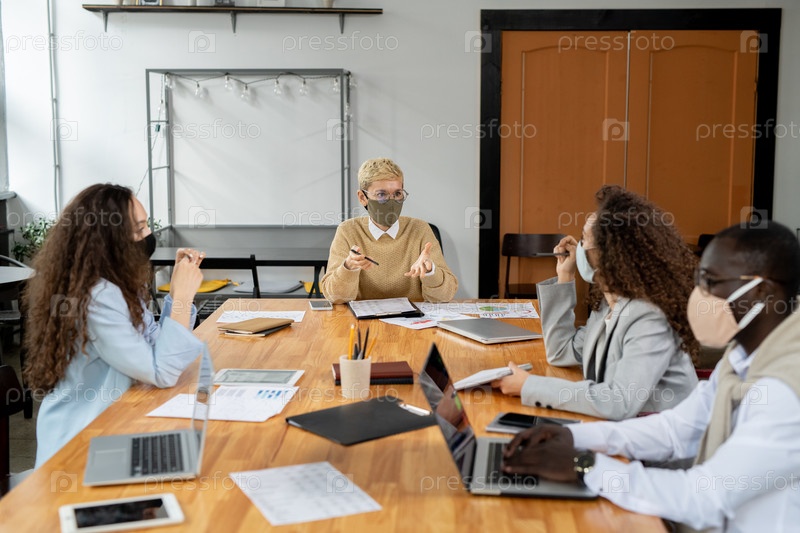 Две бизнес-женщины в масках обсуждают новые перспективы бизнеса