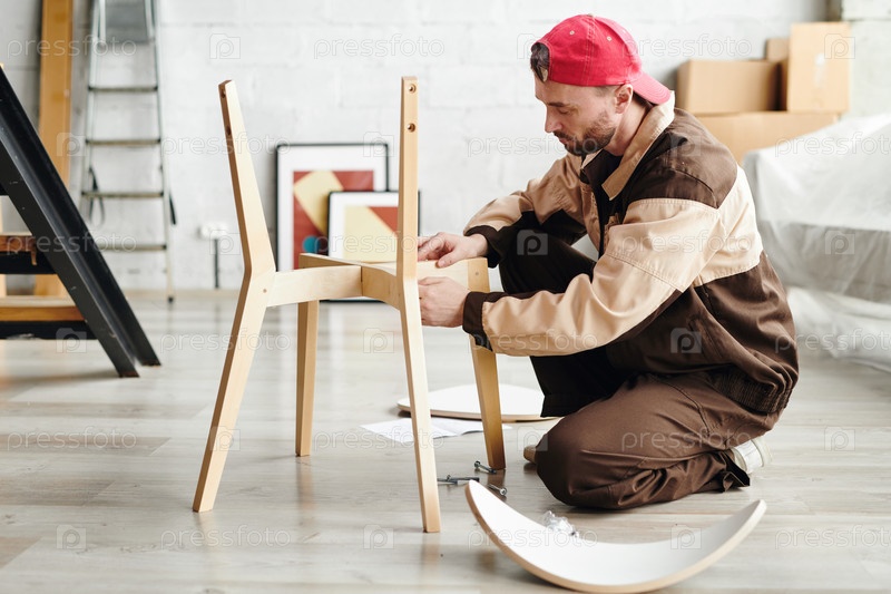 Серьезный специалист по сборке мебели в области рабочей одежды, собирающий деревянные стулья в новой квартире или студии