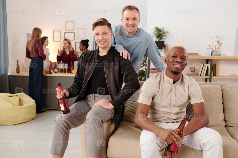 Счастливые молодые межкультурные мужчины с бутылками пива, расслабляющиеся на диване на вечеринке