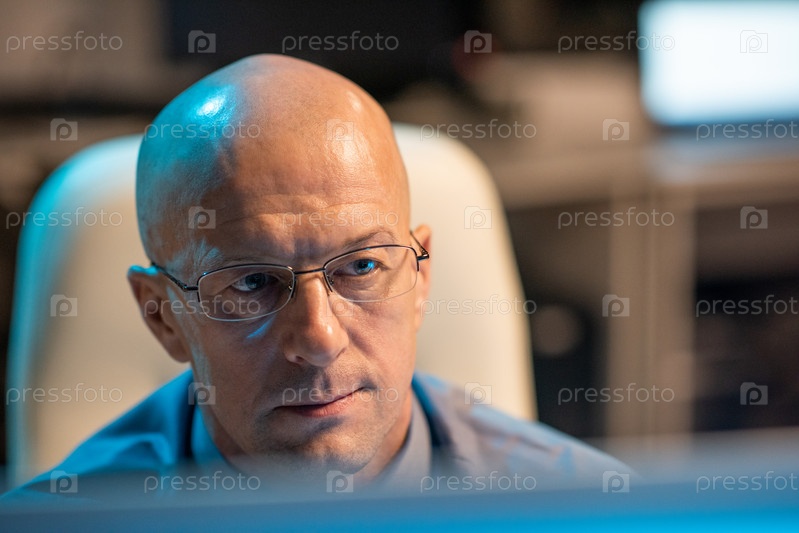 Опытный бизнесмен в очках смотрит на экран компьютера