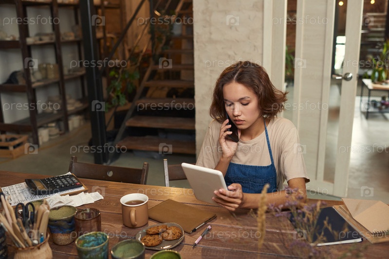 Молодая женщина со смартфоном за ухом смотрит на экран планшета