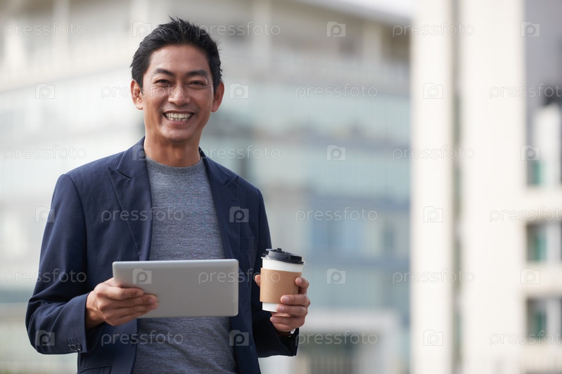 Счастливый предприниматель средних лет с столом