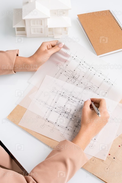 Руки молодой женщины-инженера с ручкой на бумаге, рисуя эскиз у стола