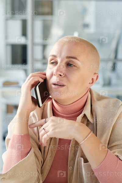 Уверенная в себе молодая деловая женщина с лысой прической, разговаривающая по сотовому телефону в современном офисе