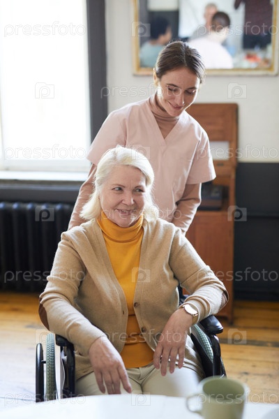 Пожилая женщина на инвалидном кресле в доме престарелых