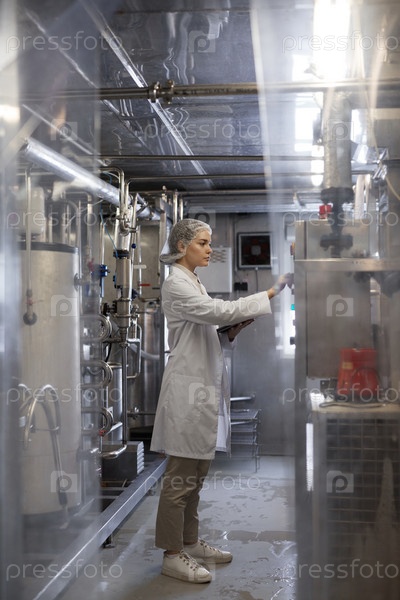 Женщина, контролирующая производство на пищевой фабрике