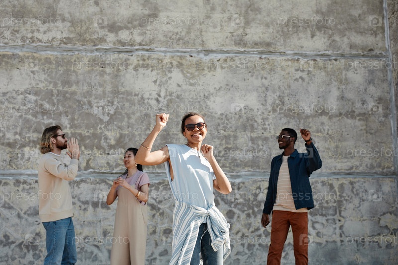 Разнообразная группа молодых людей танцуют в городе