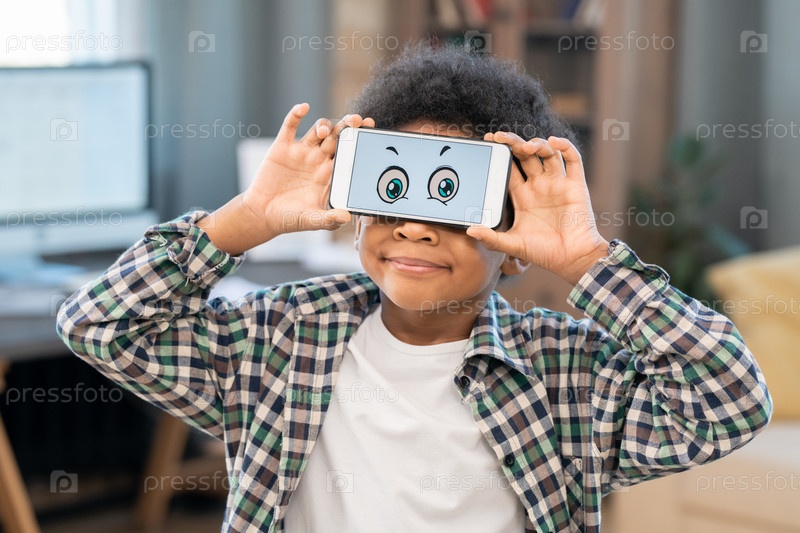 Милый мальчик, держащий смартфон с забавными глазами на экране перед его лицом
