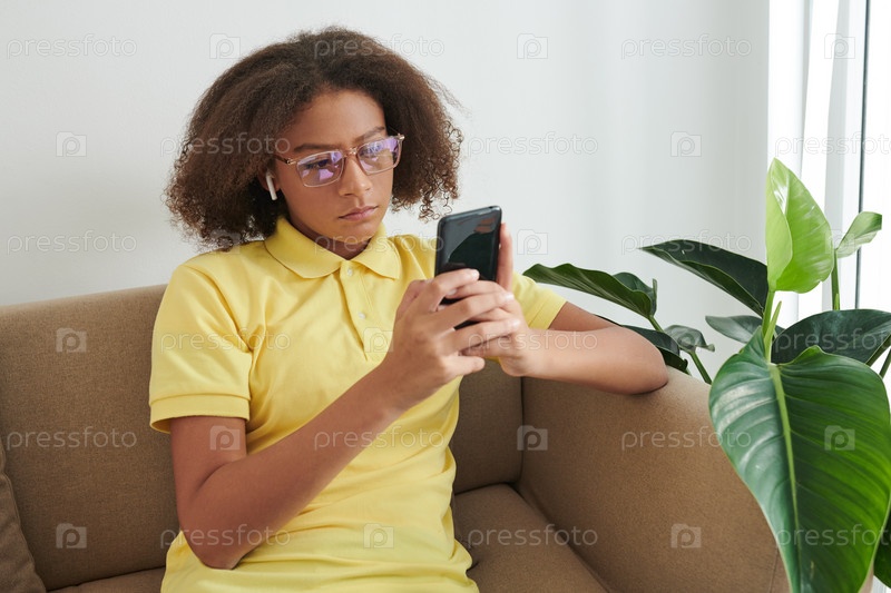 Серьезная девушка прокручивает социальные сети