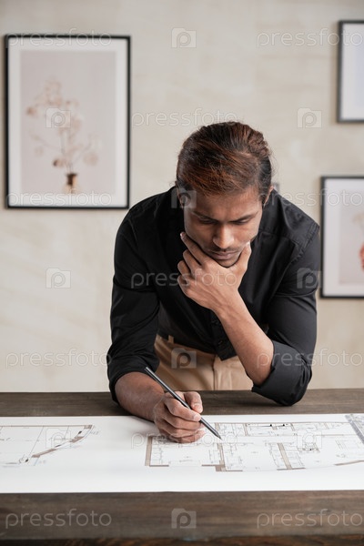 Сосредоточенный дизайнер зданий изучает план дома
