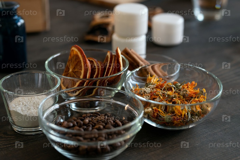 Группа мисок с кофейными зернами, сухими фруктами и цветами и другими ингредиентами